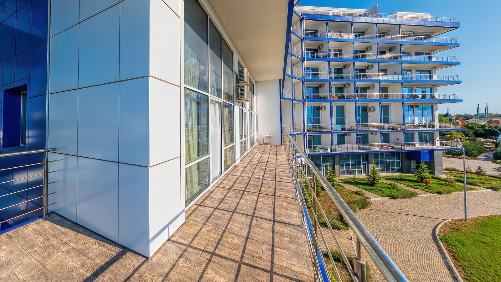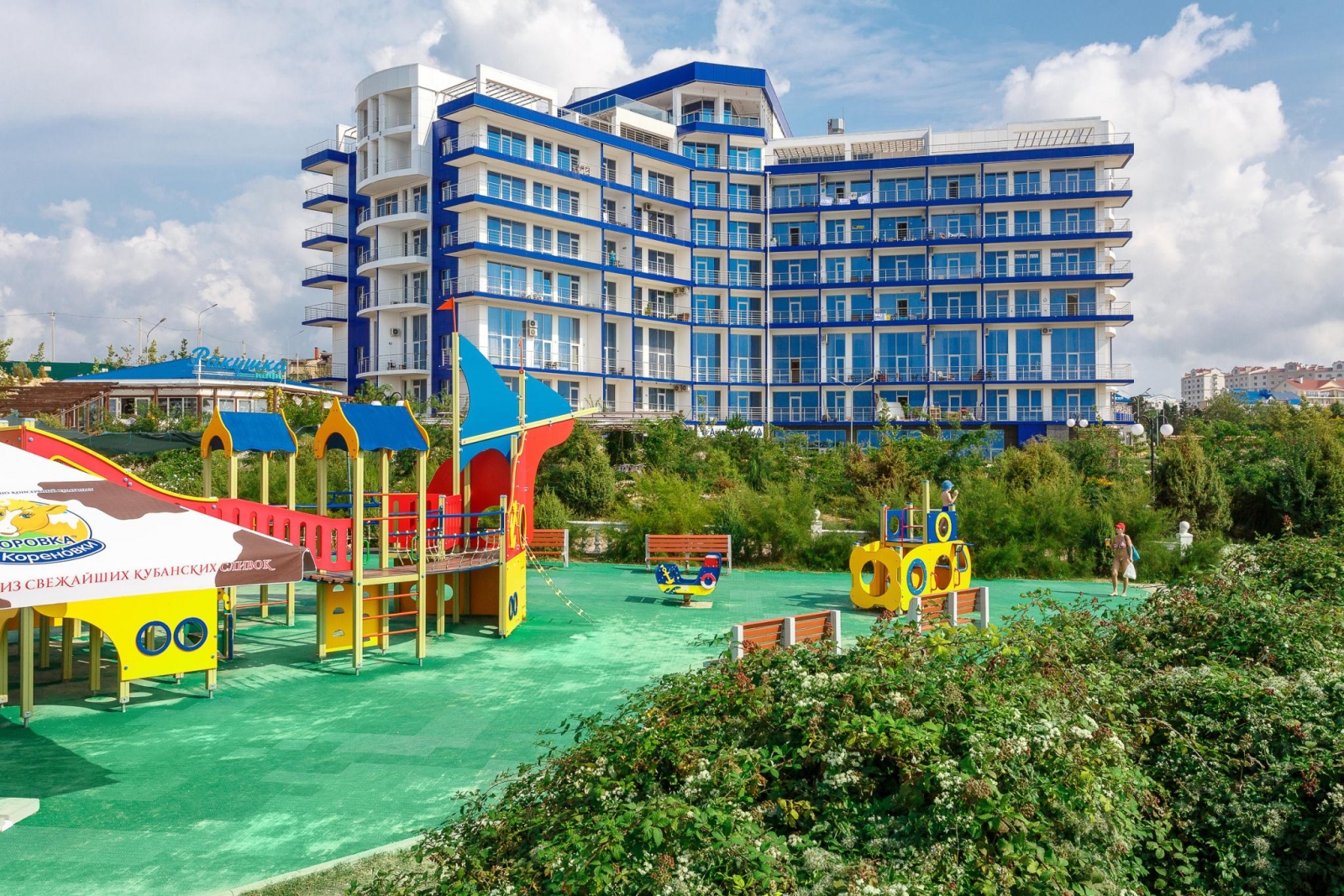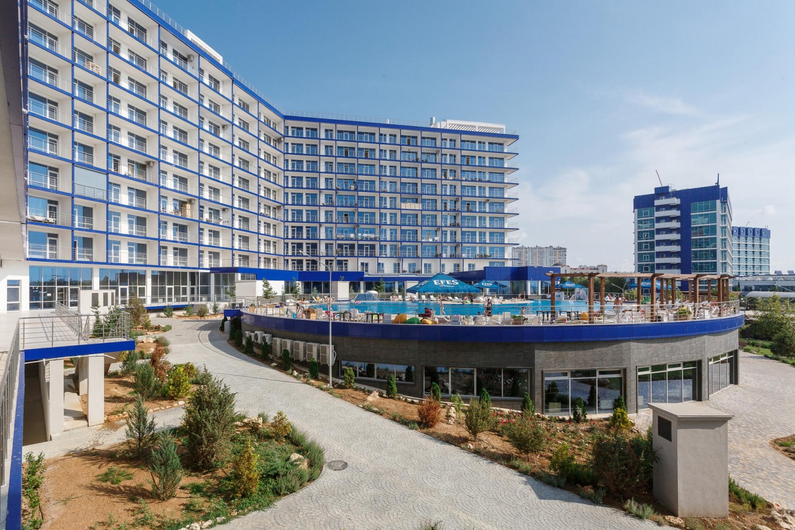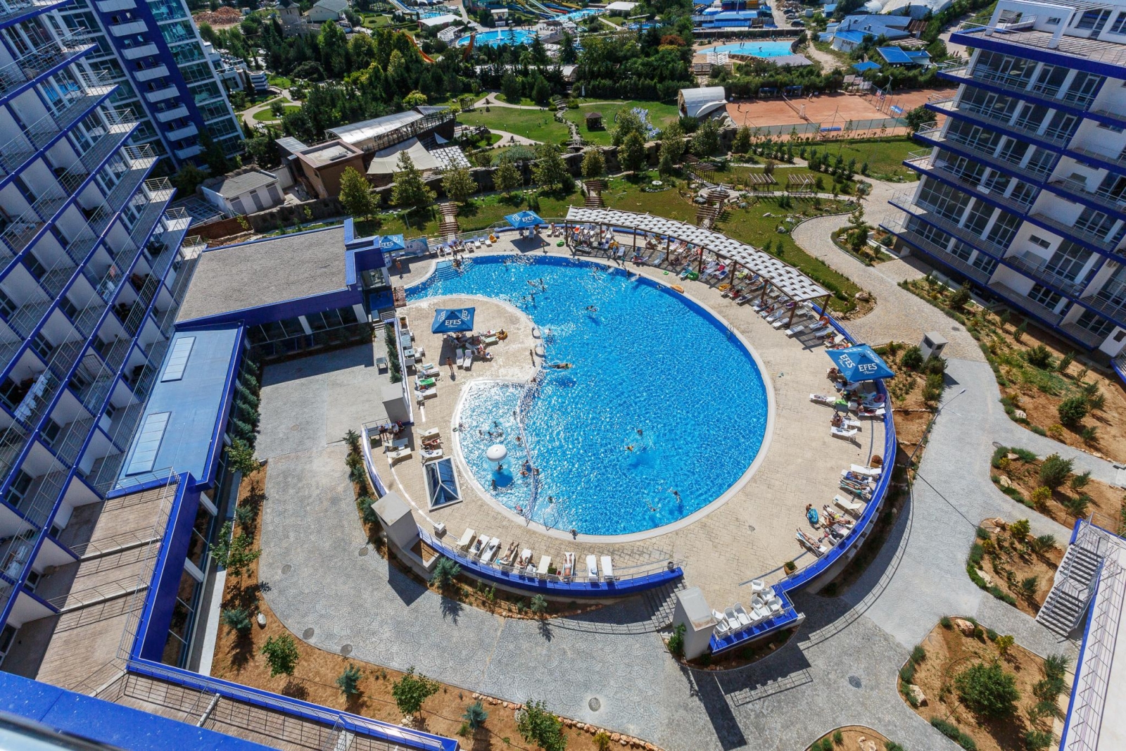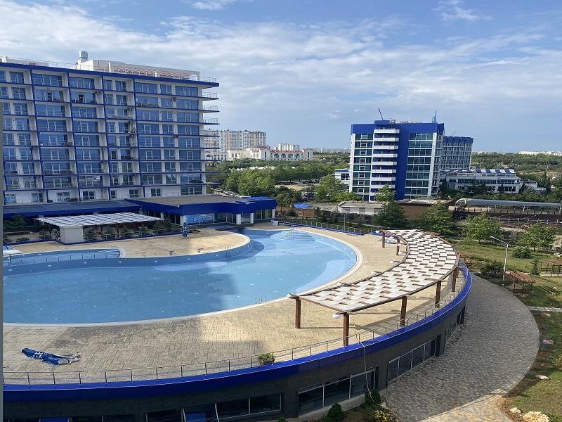 Апартаменты «Апарт-Сити Ирида» расположены в Гагаринском районе города Севастополя в шаговой доступности от Парка Победы, между бухтами Стрелецкая и Круглая. В десяти минутах ходьбы находится красивая набережная с белоснежной балюстрадой, аквапарк «Зурбаган», много различных баров и кафе. В шаговой доступности сетевые магазины и остановки общественного транспорта. За двадцать минут можно доехать до центра и археологического заповедника «Херсонес Таврический» Автовокзал и железнодорожный вокзал находятся в десяти километрах от отеля, а до аэропорта Симферополя около двух часов пути. Гостиничный комплекс состоит из корпусов «Аквамарин» и «Аква Deluxe», где разместились комфортабельные стильные апартаменты. Отдыхающим предлагаются двухкомнатные и двухуровневые номера, часть из которых имеет панорамные окна с видом на море. Во всех апартаментах помимо современного мебельного гарнитура, кондиционеров, ЖК-телевизора, есть хорошо оборудованная кухня с посудомоечной, стиральной машиной и микроволновой печью, просторный санузел оснащен ванной и необходимыми банными принадлежностями. Организованное питание не предусмотрено, но на территории «Апарт-Сити Ирида» работают четыре основных ресторана и несколько баров, в том числе фитобар. В каждом корпусе в распоряжении постояльцев крытые бассейны с пресной и соленой водой, центр с широким комплексом услуг – несколько видов бань, сауны, хамам, джакузи, массажные кабинеты, также имеется открытый бассейн с зоной отдыха во внутреннем дворе. В корпусе «Аквамарин» оборудован тренажерный зал, а в «Аква Deluxe» - большой фитнес-комплекс, где регулярно проходят занятия по аэробике и другим видам фитнеса. Для гостей устраиваются кинопоказы, анимационные шоу. Кроме этого, отдыхающим доступны услуги прачечной, беспроводной интернет на всей территории, охраняемая автостоянка. Гостиничный комплекс обладает хорошими конгресс-возможностями, в корпусах есть технически оснащенный конференц-зал, несколько оборудованных переговорных комнат. Для детей организованы игровые площадки и комнаты, детский бассейн, работают воспитатели, по запросу предоставляется кроватка-манеж.